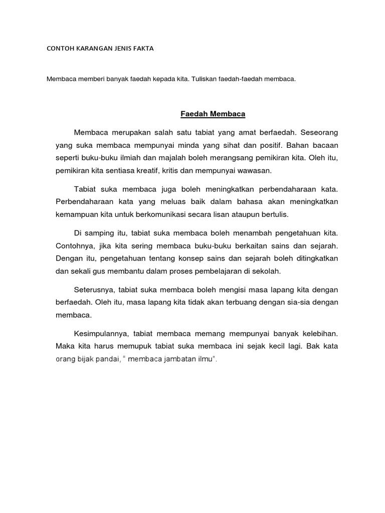 . Contoh Karangan Jenis Fakta - Karangan Fakta. Ada banyak senarai dan jenis karangan berformat antaranya ialah karangan surat kiriman rasmi surat kiriman tidak rasmi dialog wawancara temubual syarahan. CONTOH KARANGAN JENIS FAKTA Membaca memberi banyak faedah kepada kita.